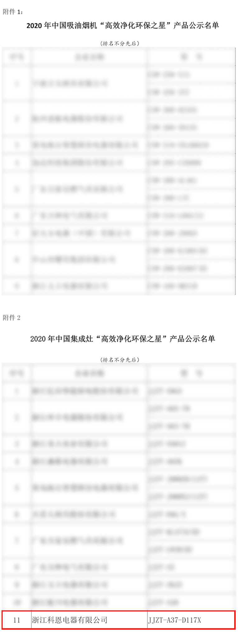 近日,由中國五金制品協會組織2020年度中國吸油煙機、集成灶“高效凈化環保之星”評比中,科恩智能變頻集成灶D117X憑借較高的油煙吸凈率及油煙分離率榮膺“高效凈化環保之星”的稱號!