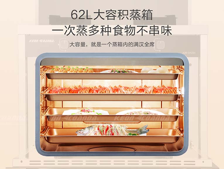 集成灶十大品牌、廚電行業(yè)十大品牌科恩D123X蒸烤消一體集成灶,擁有62L大容積內(nèi)膽,內(nèi)部設(shè)有多層蒸架,選用進口“薩萊米”陶瓷加熱盤,噴氣式4D立體蒸,噴氣升溫快,能迅速讓蒸汽達到腔內(nèi)各個區(qū)域,從而實現(xiàn)無冷角均勻加熱,蒸汽快速升騰,縮短了加熱的時間,鎖住了營養(yǎng),實現(xiàn)食物的原汁原味,使烹飪更加鮮美!