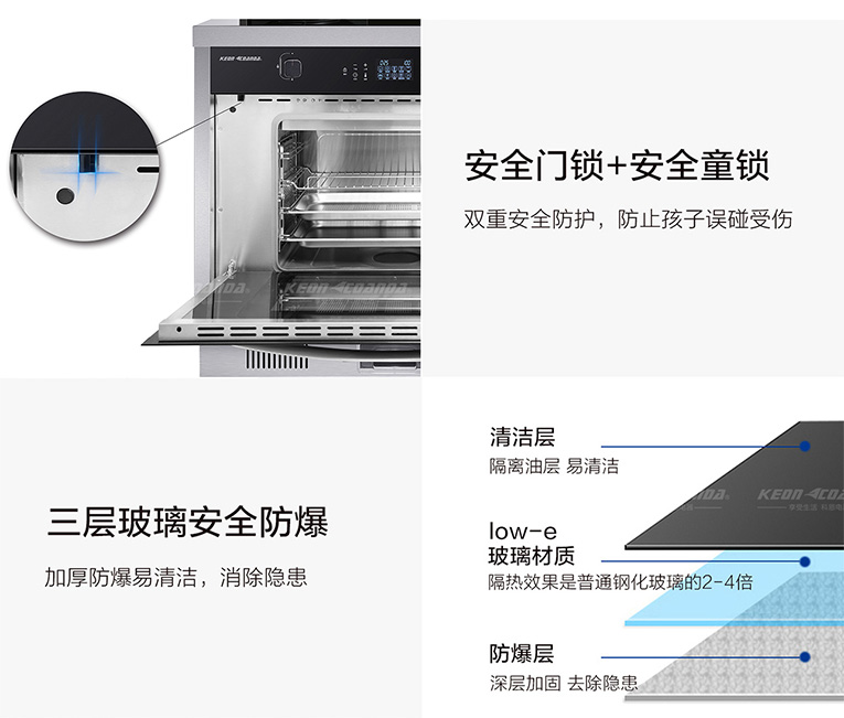 同時集成灶十大品牌、廚電行業(yè)十大品牌科恩蒸烤消一體集成灶蒸菜時也不會出現(xiàn)冷凝水滴落的現(xiàn)象,配備了蒸汽后排技術(shù),蒸汽隨著風機自動排出,菜與菜之間不會串味,這樣出來的菜品也就色香味俱全!另外箱門還有多層高溫防護技術(shù),在普遍的耐高溫鋼化玻璃基礎(chǔ)上,中間再置入一層Low-e玻璃材質(zhì),隔熱效果是普通鋼化玻璃的2-4倍,避免不小心燙傷皮膚。