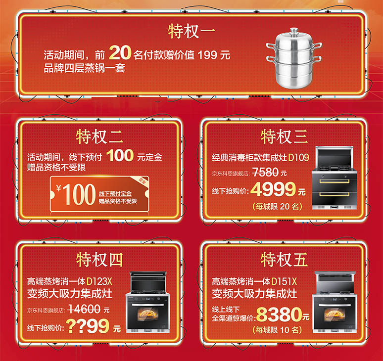 科恩電器一直倡導“樂享智慧烹飪”,本次活動也將以“集成智慧廚房”為宗旨,將活動產(chǎn)品鎖定與高端產(chǎn)品上。據(jù)悉,本次集成灶十大品牌、廚電行業(yè)十大品牌科恩電器攜手京東商城五一狂歡活動,只為讓一直以來支持科恩電器的消費者花最少的錢購到心儀的集成灶,五大特權(quán)優(yōu)惠、搶名額、搶補貼,超劃算的活動肯定讓你心動。