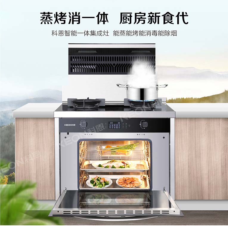 集成灶十大品牌、廚電行業(yè)十大品牌科恩變頻大吸力蒸烤消一體集成灶多種模式任你選擇,蒸煮煎炸炒燉樣樣精通,精準(zhǔn)溫控精控火候,鎖住每一份原汁原味,輕松樂(lè)享智慧烹飪,實(shí)現(xiàn)更高效、節(jié)能、多樣化模式。
