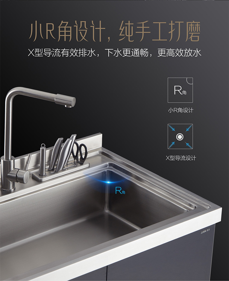 科恩集成凈洗中心,包含了X1(子母槽儲物柜款)、X2(雙槽儲物柜款)、X3(子母槽消毒柜款)、X5(雙槽超聲波消毒柜款)、X6(子母槽洗碗機十件套)產品。以集成水槽X1為例,堅持品質選材,手工匠心鑄造,利用先進科技打造高端品質,外觀設計精巧,折彎手工鑄造,一焊一接美觀大方,完美詮釋高端廚房格調生活。X1集成水槽集食材、水洗清潔、熱水系統、凈水系統、垃圾處理、收藏儲物為一體,多功能臺面設計,一切都變得如此的順手,水龍頭采用360°萬向設計,出水均勻,掌控自如。另外,X1在性能、品質上都極為出眾,首先,900mm寬體設計,大水槽加寬加深,可移動式子水槽,單槽秒變雙槽,有效提高了水槽利用率,增加了廚房收納空間,X型導流流水,搭配小R角設計,應用拉絲工藝,水槽干燥不積水,四條引水線,引導水流輕松下水。