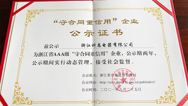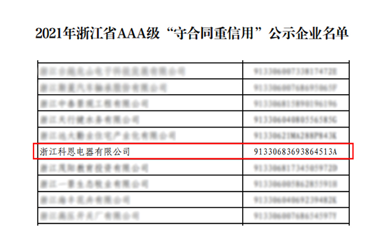 根據《浙江省“守合同重信用”企業公示辦法》規定,由企業自愿申報、系統自動測評、各地核實推薦、大數據比對和雙隨機實地核查,2021年浙江省AAA級“守合同重信用”企業公示名單出爐,憑借著誠信守法的“契約”精神,嚴謹規范的合同管理體系以及良好的經營效益,進一步強化“守法”意識的浙江科恩電器有限公司榮獲浙江省AAA級“守合同重信用”榮譽。