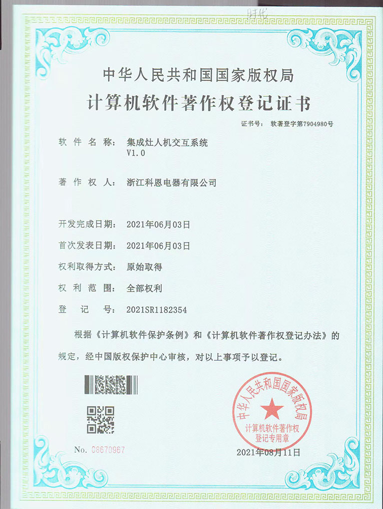 近日,由浙江科恩電器有限公司完全自主研發(fā)的集成灶人機交互系統(tǒng)V1.0軟件正式獲得國家版權局頒發(fā)的計算機軟件著作權登記證書。計算機軟件著作權是企業(yè)核心自主知識產權,是企業(yè)的“無形資產”,是企業(yè)科技的生命力和價值所在。同時,國家權威部門的認證將使搭載這些軟件的產品價值倍增。此次集成灶十大品牌、廚電行業(yè)十大品牌科恩集成灶獲得計算機軟件著作權,充分展現了企業(yè)強大的研發(fā)實力和核心競爭力。