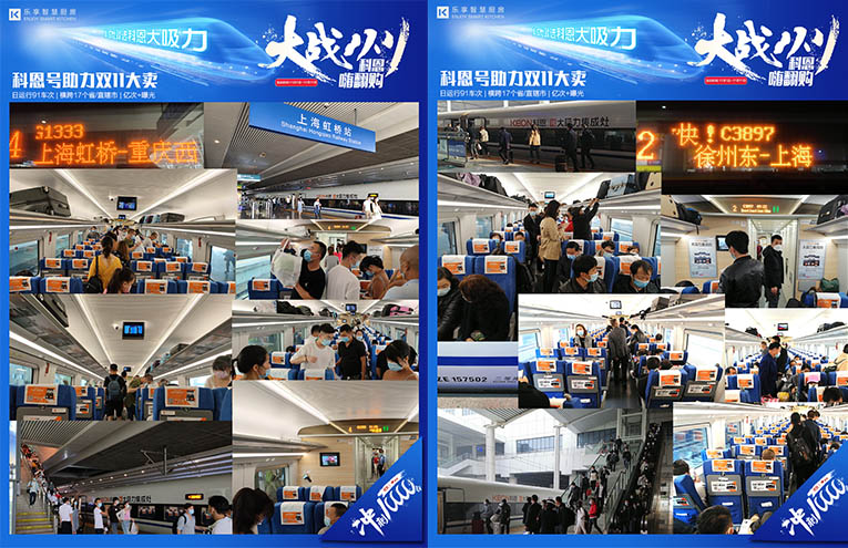 走進(jìn)“科恩號(hào)”車(chē)廂,從天幕、海報(bào)、電子屏到小桌板,都是來(lái)自科恩集成灶的霸屏推送。