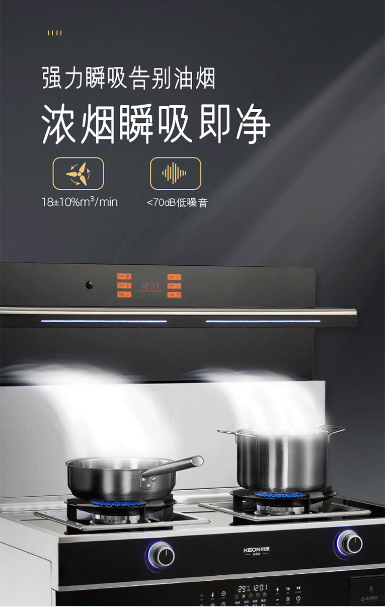 想要煙火氣,但不想要油煙味,“你好科恩”油煙凈吸,智能語音智控烹飪,解鎖無接觸式樂趣,科恩E430智能語音蒸烤消一體集成灶。