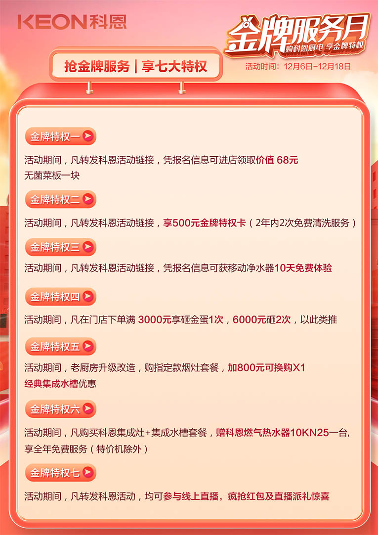 科恩“金牌服務(wù)月”經(jīng)過精心籌備盛大開啟,購科恩廚電,享金牌特權(quán)!以領(lǐng)軍者姿態(tài),開啟行業(yè)服務(wù)新典范。用戶不但可以通過科恩全國專賣店直接獲取服務(wù),還可以通過線上報名、砍價形式獲得權(quán)益,結(jié)合線下門店金牌服務(wù),聚焦客戶最及時服務(wù)需求,七大特權(quán)限時搶購!