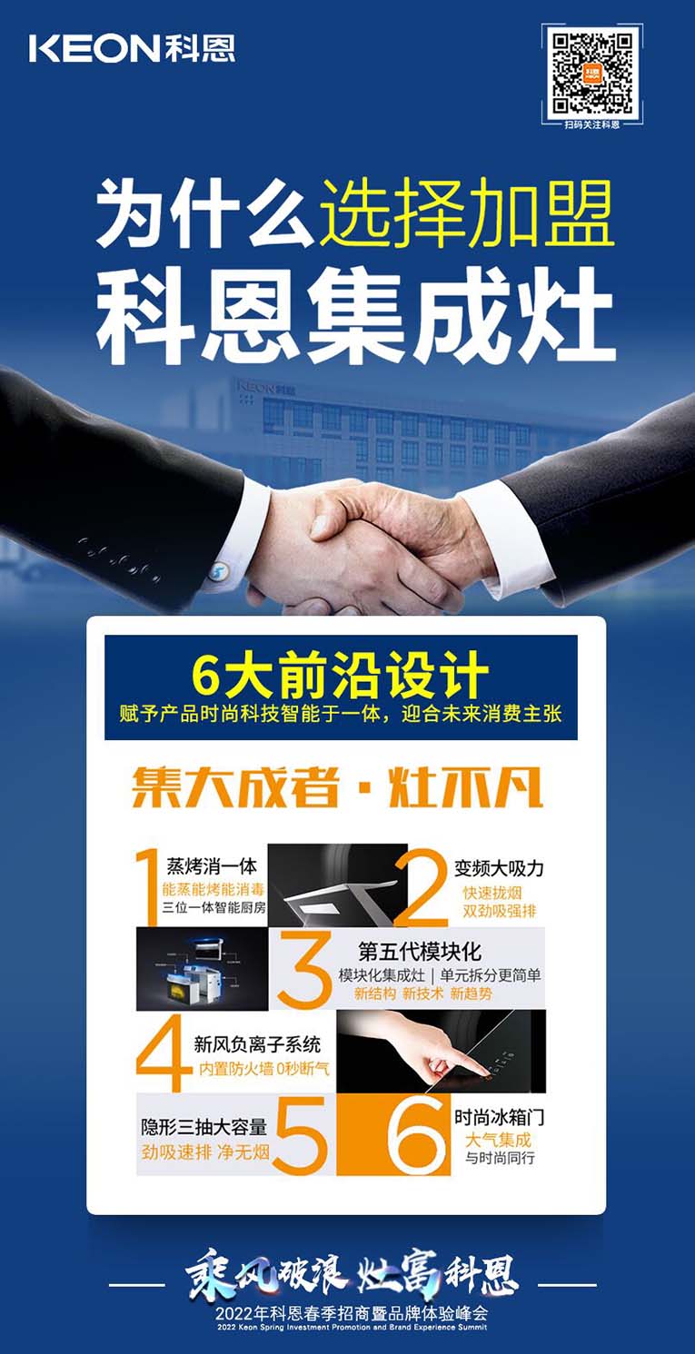 “乘風破浪,灶富科恩”2022科恩春季招商暨品牌體驗峰會將于3月18日舉行,選擇大于努力,抓住時代機遇!集成灶十大品牌、廚電行業十大品牌科恩集成灶具備優于業界的技術、高質量的保證、強大的企業實力、有保障的售后等優勢,實力加盟的不錯之選。
