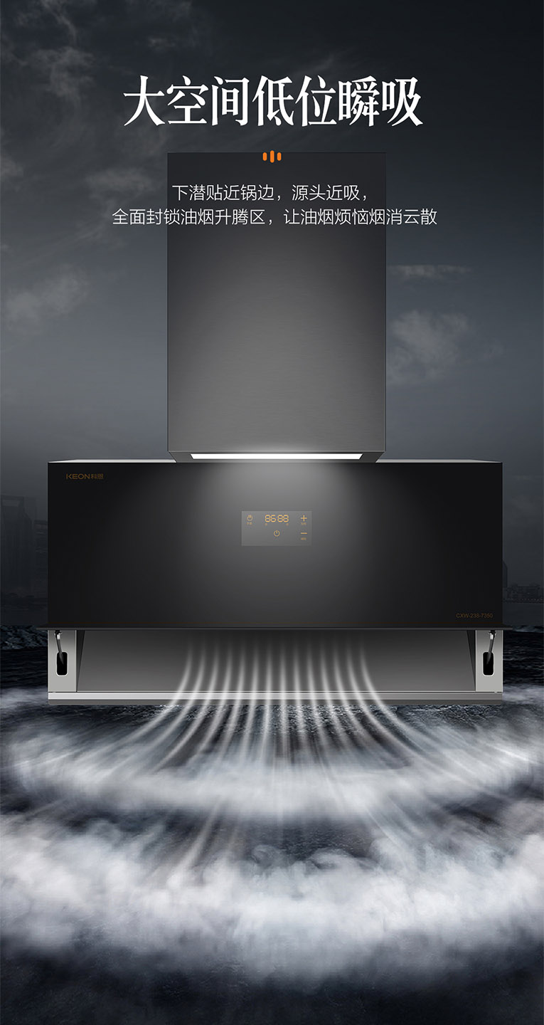 廚房環境要將就?絕不同意!高顏值的廚房離不開高性能的廚電搭配,集成灶十大品牌、廚電行業十大品牌科恩新一代大吸力煙機7350,大吸力,不跑煙!整機采用輕奢黑晶玻璃面板,11.5cm纖薄機身,搭配大寬屏柔光照明,烹飪視野更加開闊,無需低頭就能分辨調味料,盡情享受廚房的聚光燈。
