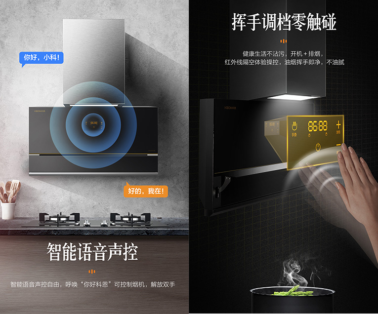 目前大多數油煙機都需要進行手動按鍵控制,有時候會出現炒菜到一半發現油煙機沒開,手上油污太多按鍵不靈敏等情況,科恩新一代大吸力煙機7350最大的亮點在于擁有智能語音控制與體感操控,健康生活不玷污,開機+排煙控制,隔空體驗操控,解放雙手不油膩。