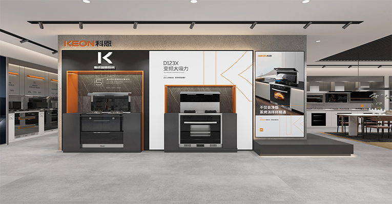 簡約、大氣、精美的視覺沖擊讓人印象深刻,通過“視覺+產品+體驗”的融合,以差異化彰顯品牌個性,讓消費者通過感知產品來感受品牌,對多個區域進行場景重構,產品陳列區、廚房場景、品牌背書、洽談區等,通過模塊化的方式,將核心產品模塊以及開放式廚房體驗場景植入門店,體現了更具應用價值的“廚房新國潮,科恩新三件”!