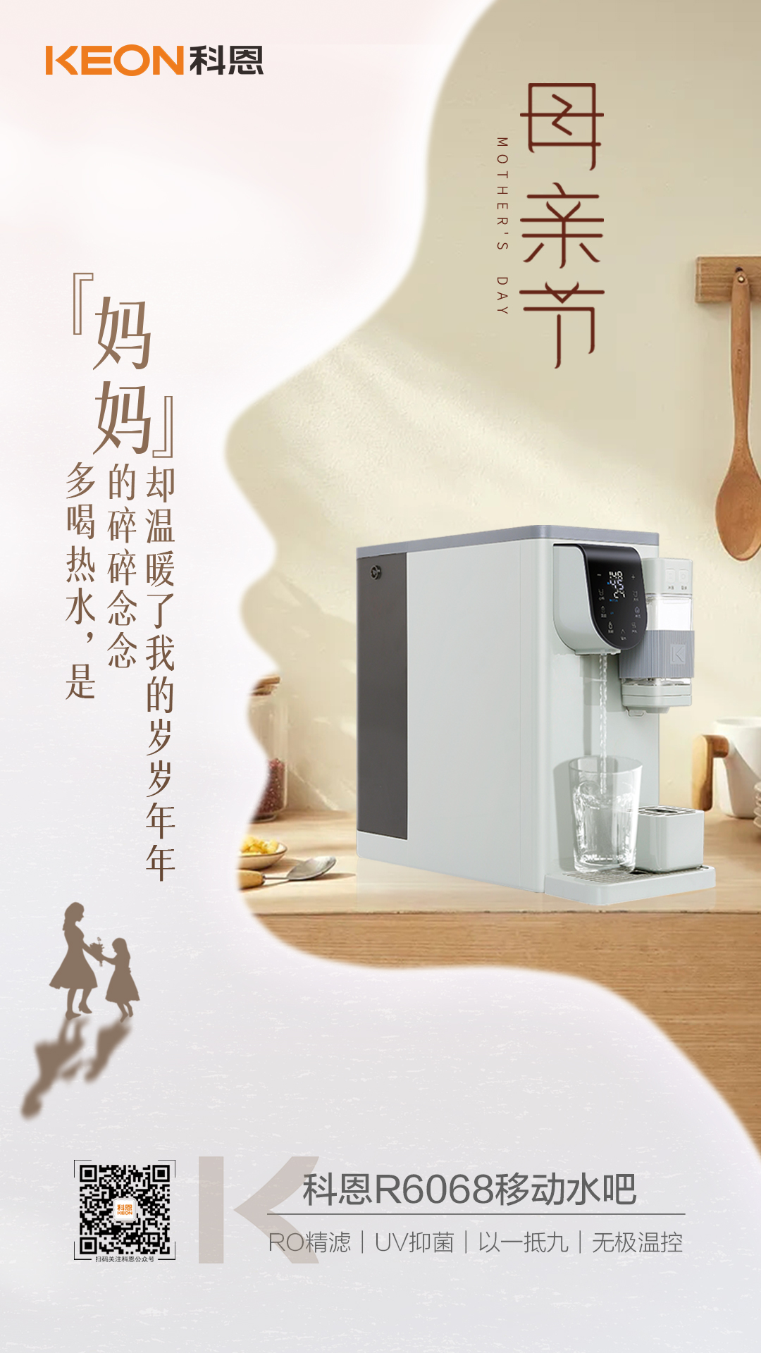 咱家老房水質差,長期飲用對身體影響特別不好,給您和爸選了一臺科恩集成式凈水器,體積小,不用安裝,哪都能放,功能可多了:凈水、加熱、調溫、直飲、溫度和水量都能自由選擇,還有你們最愛的一鍵泡茶功能呢!他的濾芯是0.1納米RO精濾,過濾精度遠超病毒直徑,能有效濾除水中的重金屬、農藥、余氯等有害物質,還能改善水質口感,增加對人體有益的礦物質!