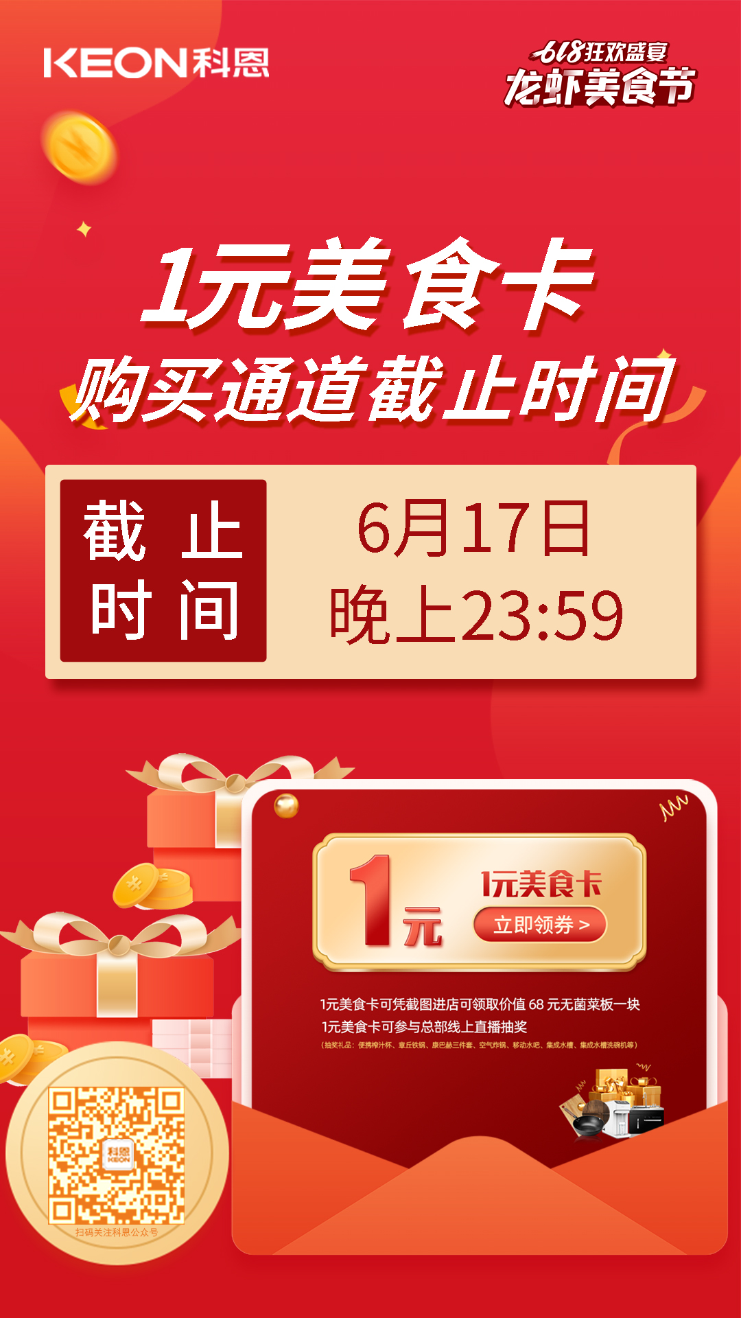 注意!注意!注意!科恩集成灶618狂歡盛宴——龍蝦美食節(jié)將于6月18日14點直播大抽獎后落下帷幕,1元美食特權(quán)專屬卡權(quán)購買通道也將于今晚(6月17日)23:59準時關(guān)閉!薅羊毛福利即將進入倒計時!還沒有購買一元特權(quán)卡的朋友們要抓緊時間了!話不多說,最后一次薅羊毛安利,拿走不謝!