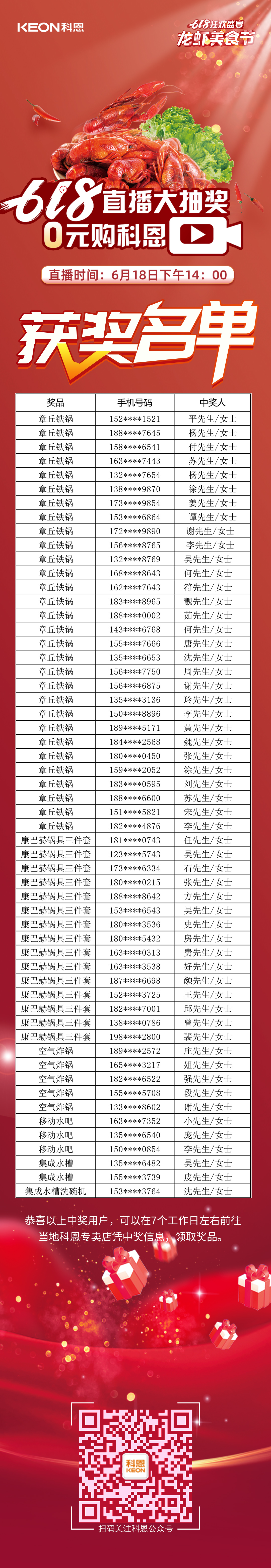 萬人品美食,0元搶科恩——科恩龍蝦美食節(jié)圓滿落幕,千城千店,共襄盛舉,感謝大家對(duì)科恩集成灶的大力支持,618直播大抽獎(jiǎng)獲獎(jiǎng)名單火熱出爐,恭喜以上獲獎(jiǎng)的小伙伴們,請(qǐng)盡快聯(lián)系當(dāng)?shù)?a href="http://m.shanghaihuoyun.cn/" target="_blank">科恩門店,快把獎(jiǎng)品領(lǐng)回家吧!