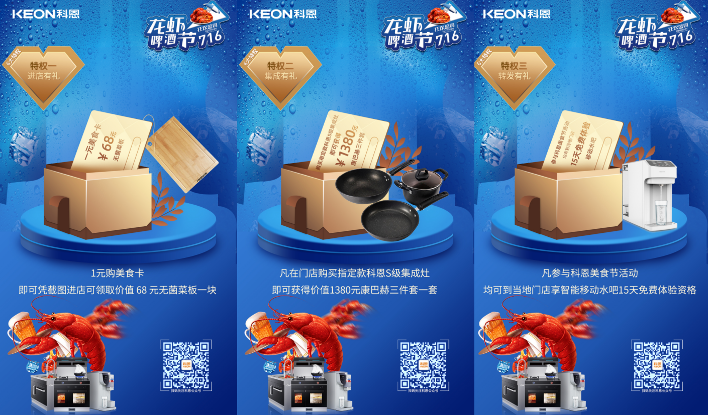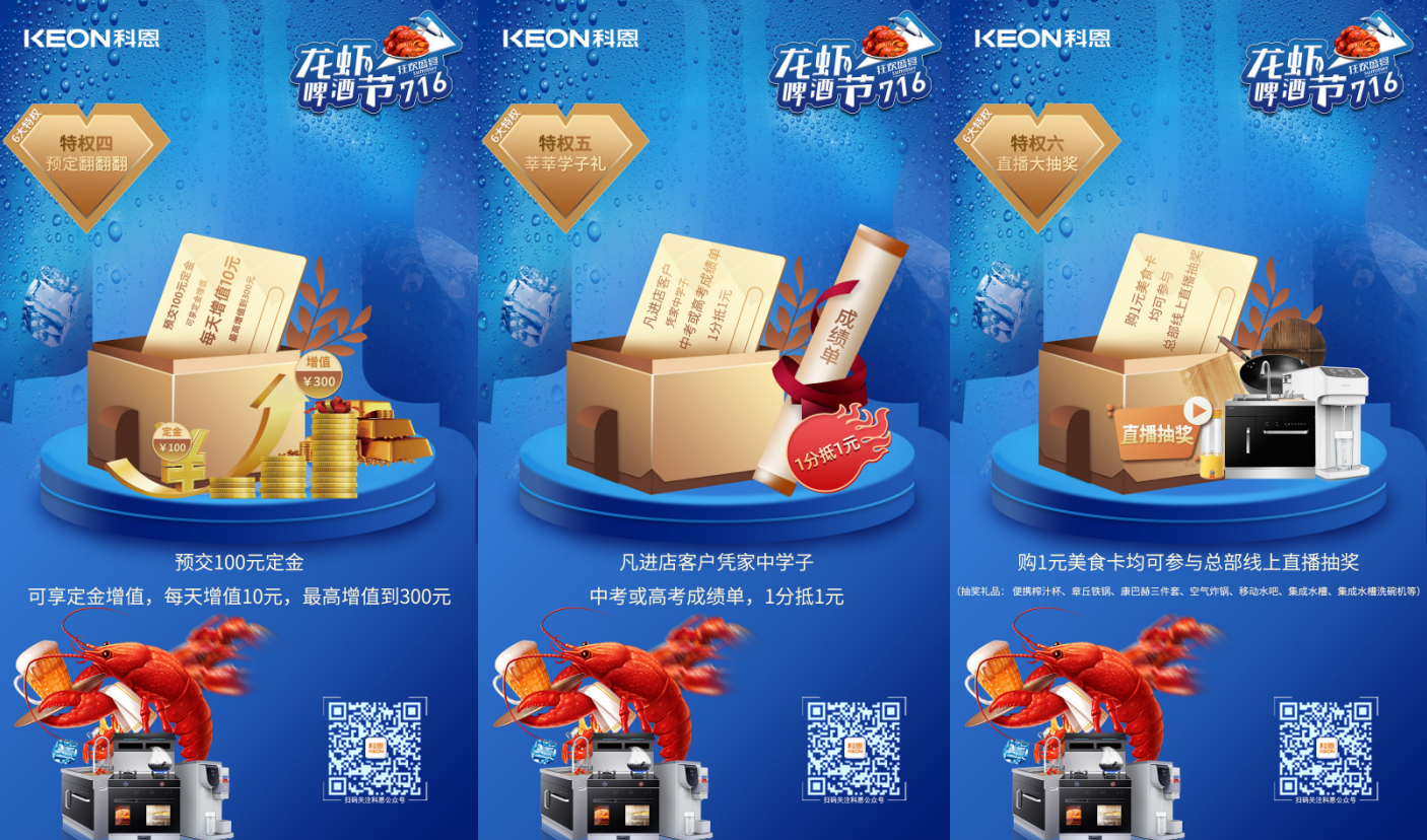 7月2日-7月16日,由科恩集成灶舉辦的“清涼一夏,無限暢飲”龍蝦啤酒節活動正在如火如荼的進行中,炎炎夏日,何以消暑,當然是去科恩集成灶門店“蹭”免費的空調,現場不僅有各種口味的小龍蝦供大家品嘗、冰爽啤酒讓你清涼一夏,更有進店有禮、集成有禮、轉發有禮、預定有禮、莘莘學子禮、直播大抽獎等精彩活動等你參與!