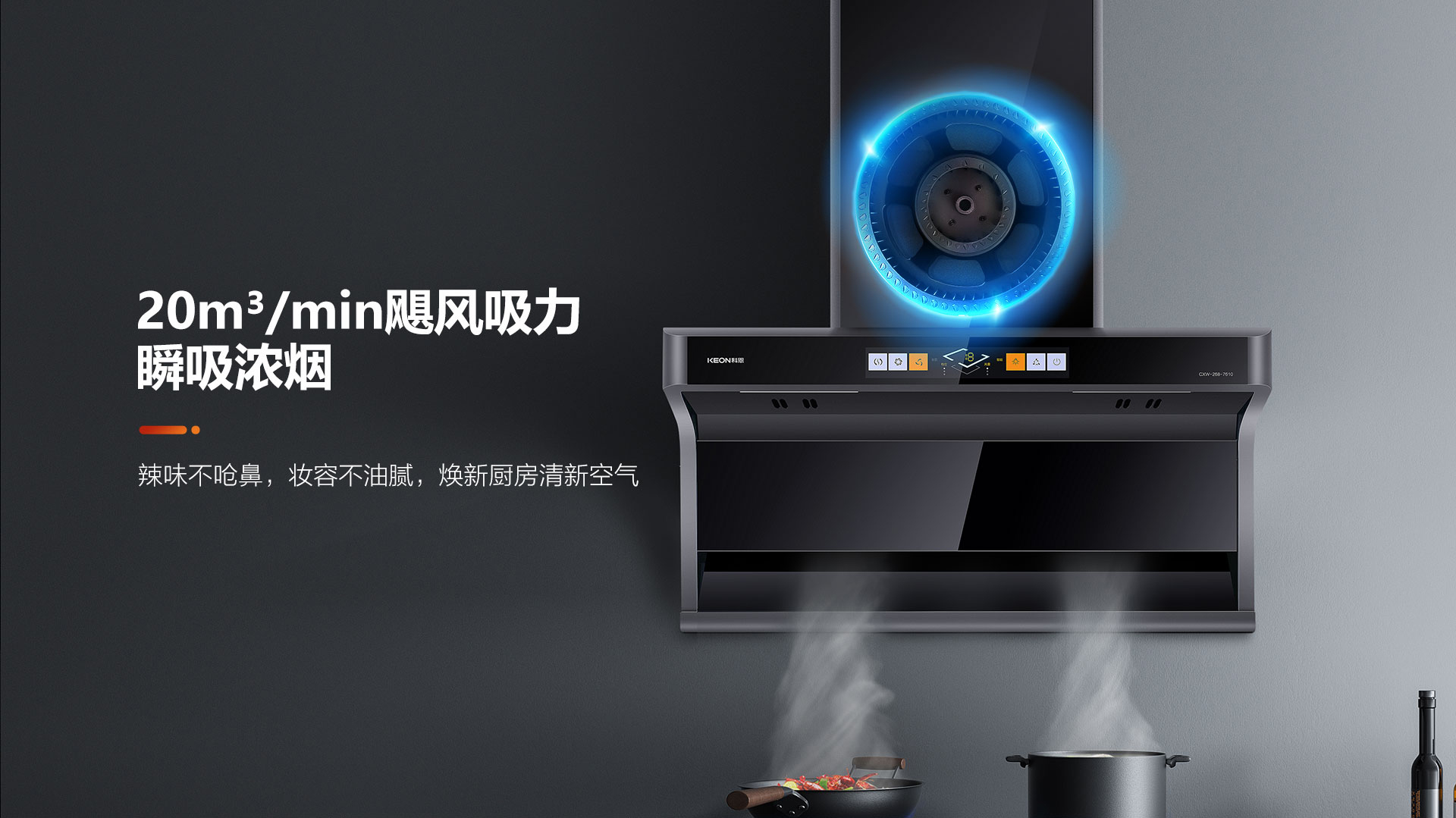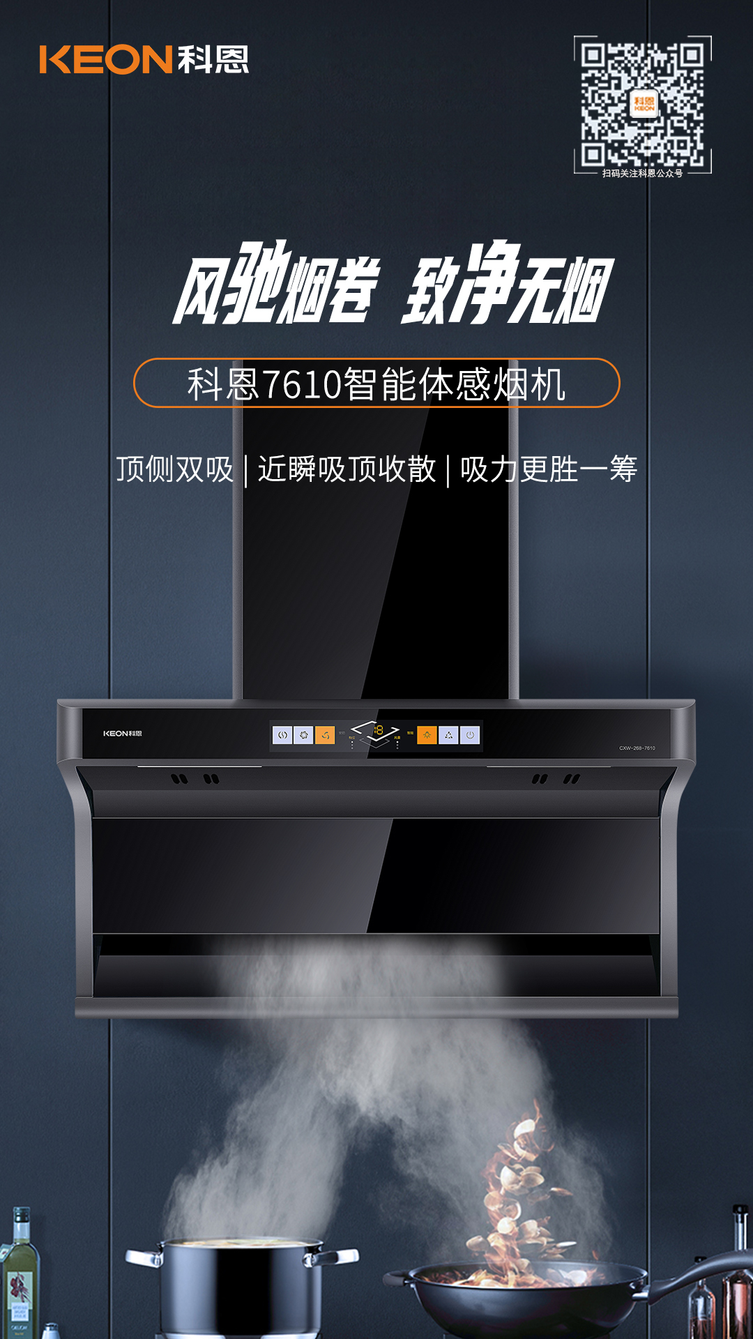 科恩7610頂側雙吸智能體感煙機,吸力更勝一籌!