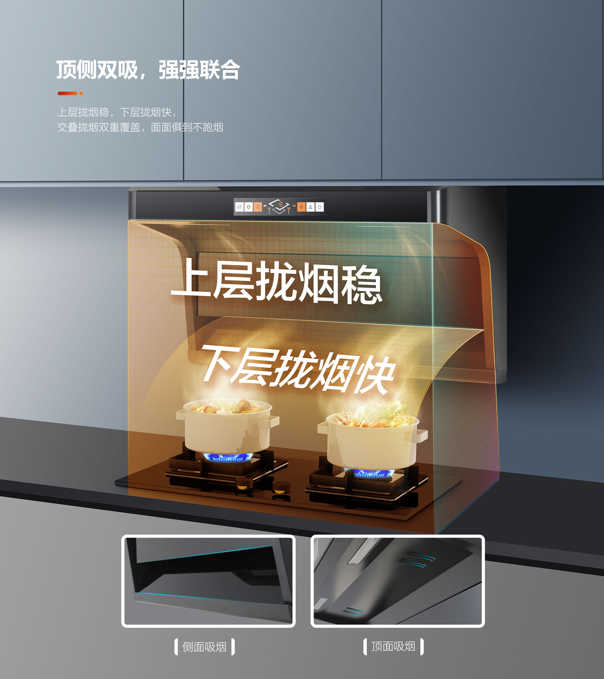 下近吸,側吸下捕攏煙快,近距離攏吸油煙,抽凈爆炒油煙,把油煙扼殺在萌芽之中,快速凈煙不上臉。上攏吸,高位頂吸攏煙穩,輔助捕捉剩余逃逸的油煙,排盡余煙不嗆鼻。