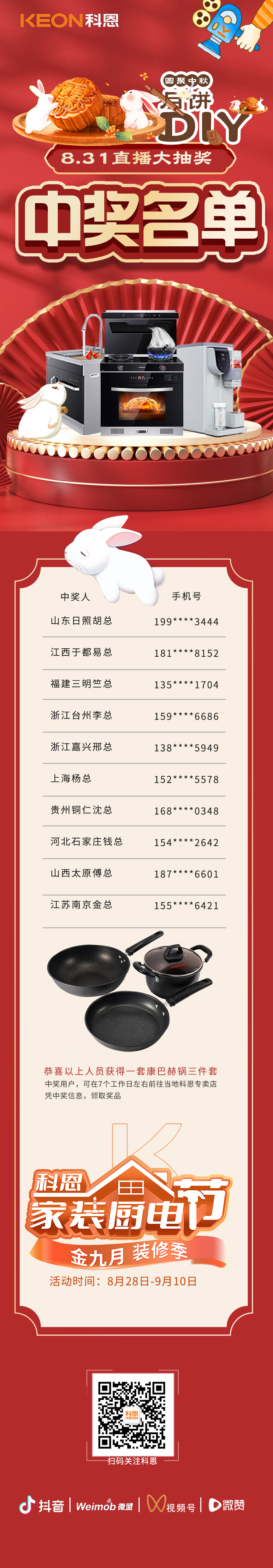8月31日晚7點(diǎn),科恩家裝廚電節(jié)直播第一期——圓聚中秋,月餅DIY已順利錄下帷幕,直播現(xiàn)場(chǎng)精彩紛呈,不僅有主播手把手教做科恩私房月餅,更有購(gòu)1元廚電特權(quán)卡抽大獎(jiǎng)活動(dòng)!此時(shí)此刻,想必屏幕前的你們一定非常關(guān)注獲獎(jiǎng)結(jié)果,話(huà)不多說(shuō),快來(lái)看看,這次獲獎(jiǎng)名單中有你嗎?