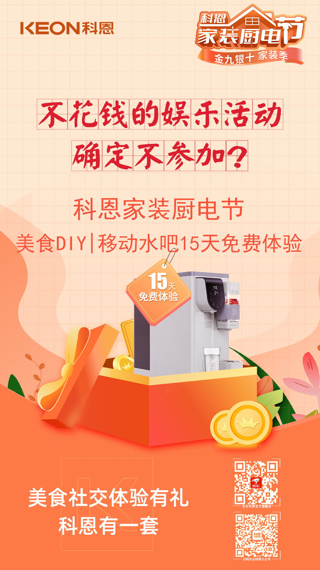 明天就是周末了,別只在家擺爛!可逛街費錢,宅家費電,有沒有什么不花錢又能carry全場的娛樂活動?來科恩家裝廚電節,場地、設備、機器早已準備就緒,美食DIY,沉浸式體驗,共同制作美食,一起分享心得,還有15天免費體驗的移動水吧帶回家,美食社交,體驗有禮,確定不參加?