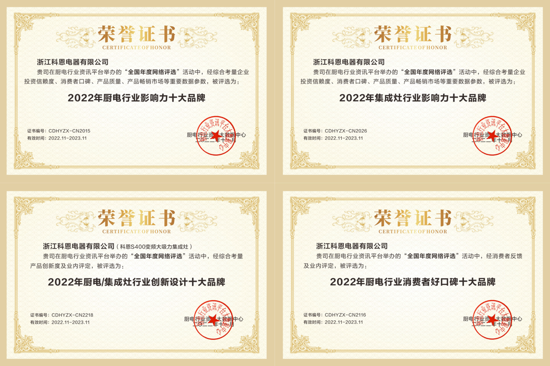自2022年廚電/集成灶品牌推薦活動啟動以來,經過企業篩選、資格初審、后臺評論、留言推薦、數據核對、綜合評審等階段。科恩電器憑借強大的綜合實力和品牌影響力在廚電行業資訊平臺評選中脫穎而出,斬獲“十大品牌”四大殊榮!
