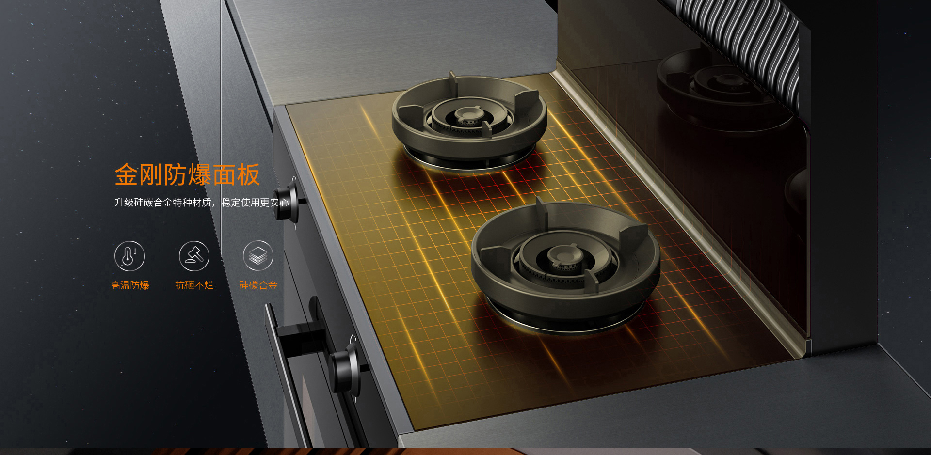 4. 臺(tái)面采用硅碳合金特種材質(zhì),不僅防爆耐高溫,還不沾油,更易潔。