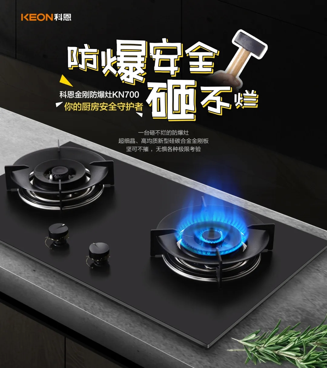 灶具則選擇了科恩KN700金剛防爆灶。近年來廚房事故頻發(fā),灶具炸裂不再少數(shù)。因此,科恩KN700金剛防爆灶在材質(zhì)上選擇了防爆金剛板,硅碳合金特種材質(zhì)可耐高溫1500℃,高于國標(biāo)3倍以上,更安全!在抗沖擊方面,防爆金剛板是能抗住工地大鐵錘的暴擊,真正做到0級防爆高硬度,更堅固,更安全!如此有效杜絕了廚房安全事故。