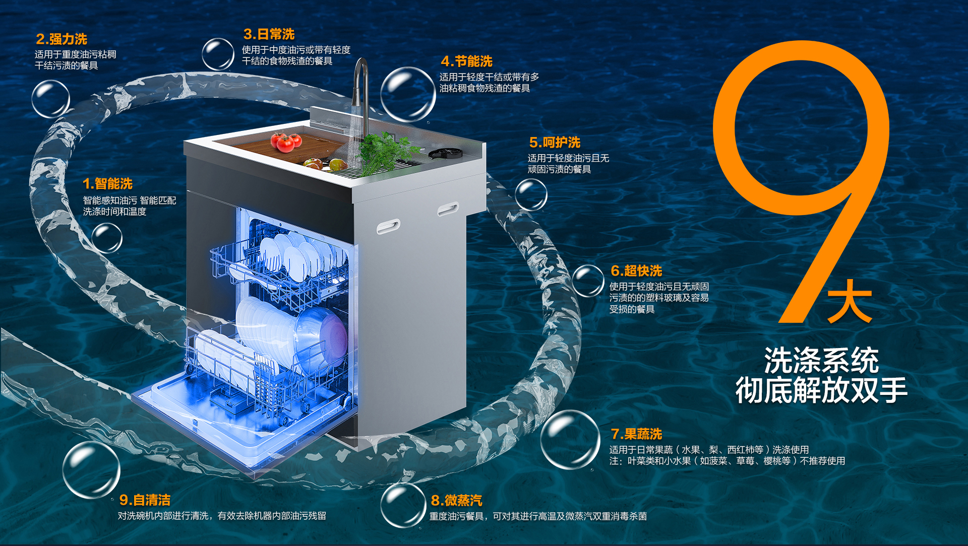 9大定制洗滌系統,讓碗筷清洗更智慧。同時,還貼心設置清洗蔬果,告別蔬果農殘。