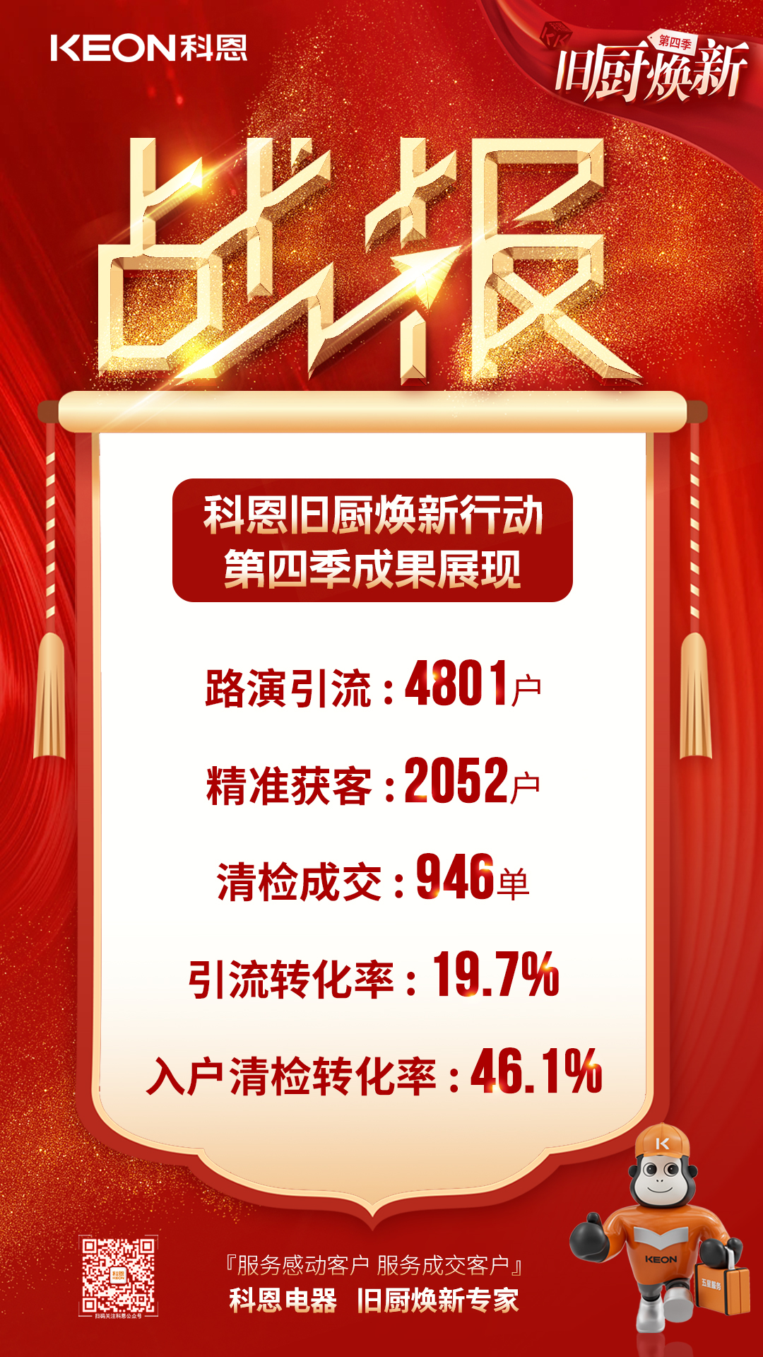時(shí)至今日,為期20天的科恩“第四季舊廚煥新”活動(dòng)已然結(jié)束。本次煥新活動(dòng)路演精準(zhǔn)引流4801戶,成交946單!轉(zhuǎn)化率高達(dá)46.1%!堪稱行業(yè)佳績(jī)!