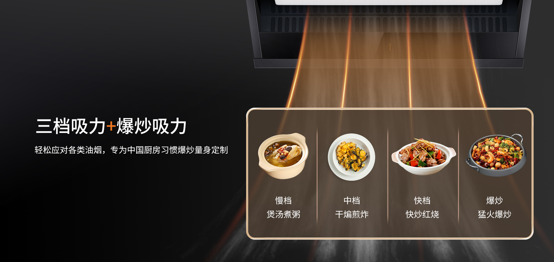 三檔吸力+爆炒吸力,輕松應對各類油煙,專為中國廚房習慣爆炒量身定制。