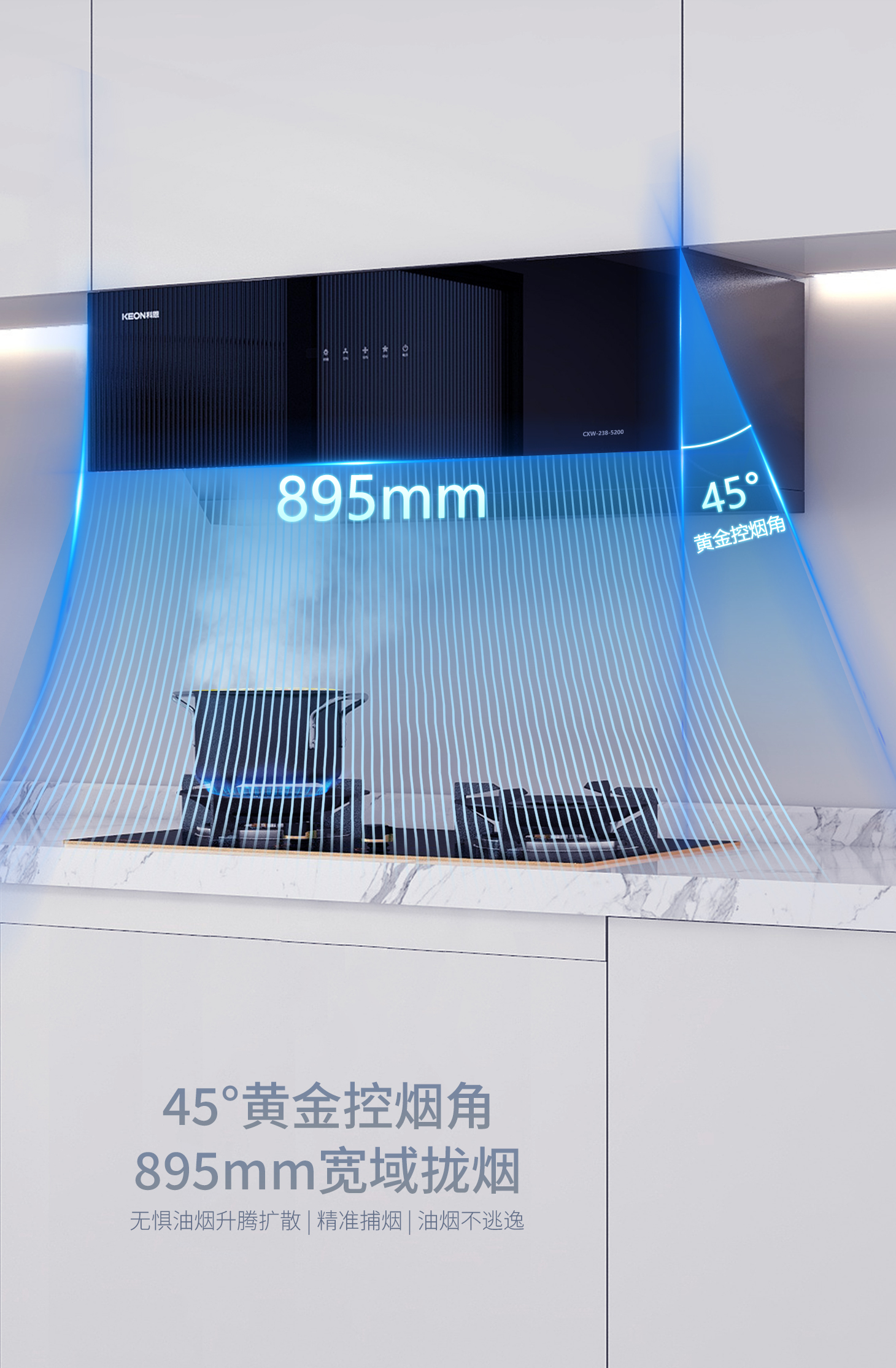 同時(shí),5200特有的45°黃金吸煙角,輕松阻絕油煙上升可能,搭配23m³/min颶風(fēng)吸力,徹底告別了油煙飄散的煩惱,輕松打造無煙廚房。