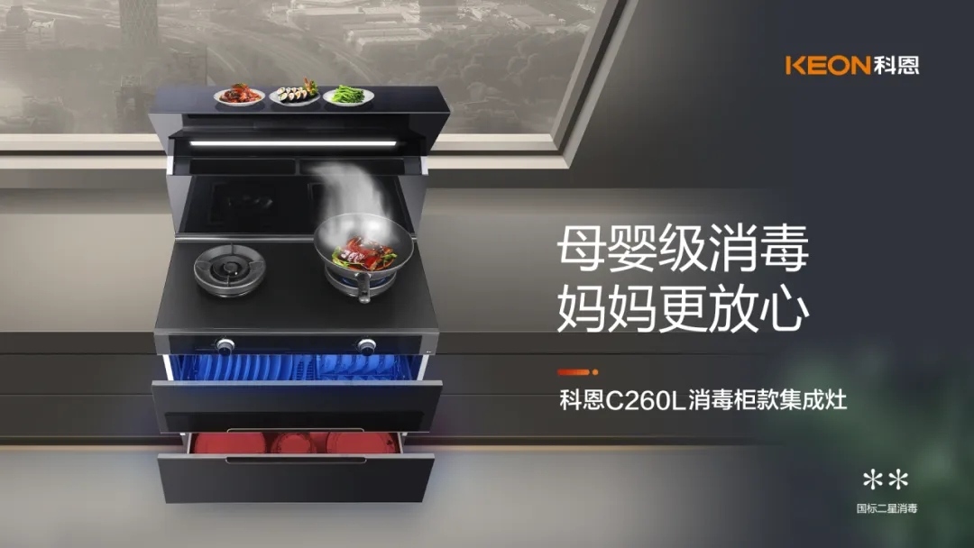 因此,為了小寶貝的健康,這款科恩C260L消毒柜款集成灶,推薦給您!不僅一臺頂多臺,且國標二星消毒,能消殺更多細菌。