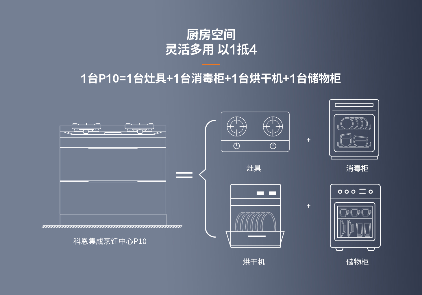 空間革命,小戶救星。告別傳統廚房束縛,解決刻板安裝限制。科恩新品集成烹飪中心p10,0.5個立方,化繁為簡。空間釋放,不占櫥柜空間;主柜清爽,不積油免清洗,上烹下凈,立體空間全能集成