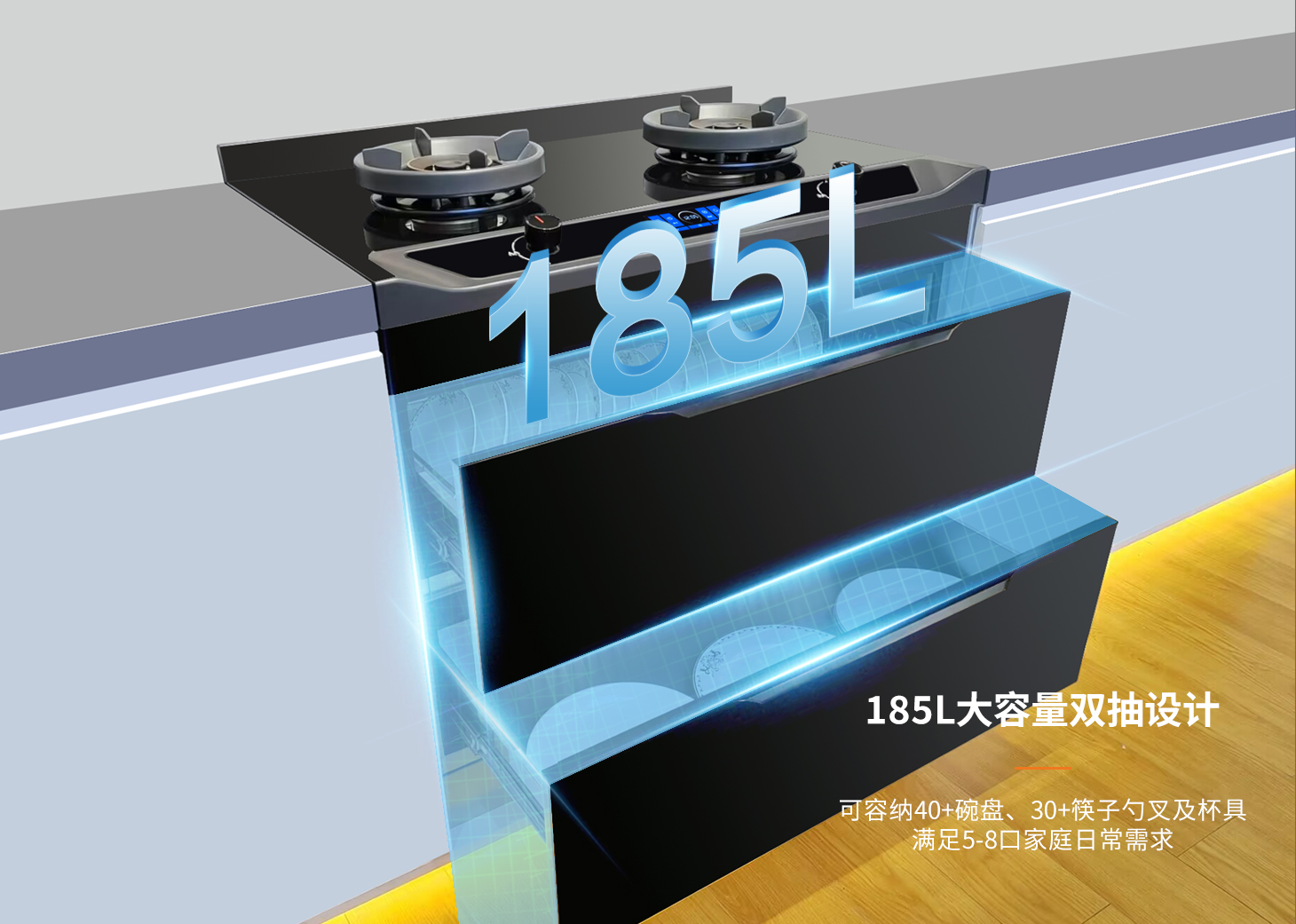 全域消殺,健康護航避免餐具二次污染,呵護全家人健康安全。科恩集成烹飪中心,185L大容量消毒艙體,紫外線+臭氧+紅外三重消殺奶瓶餐具統統立體滅菌,二星級認證看得見的安全!