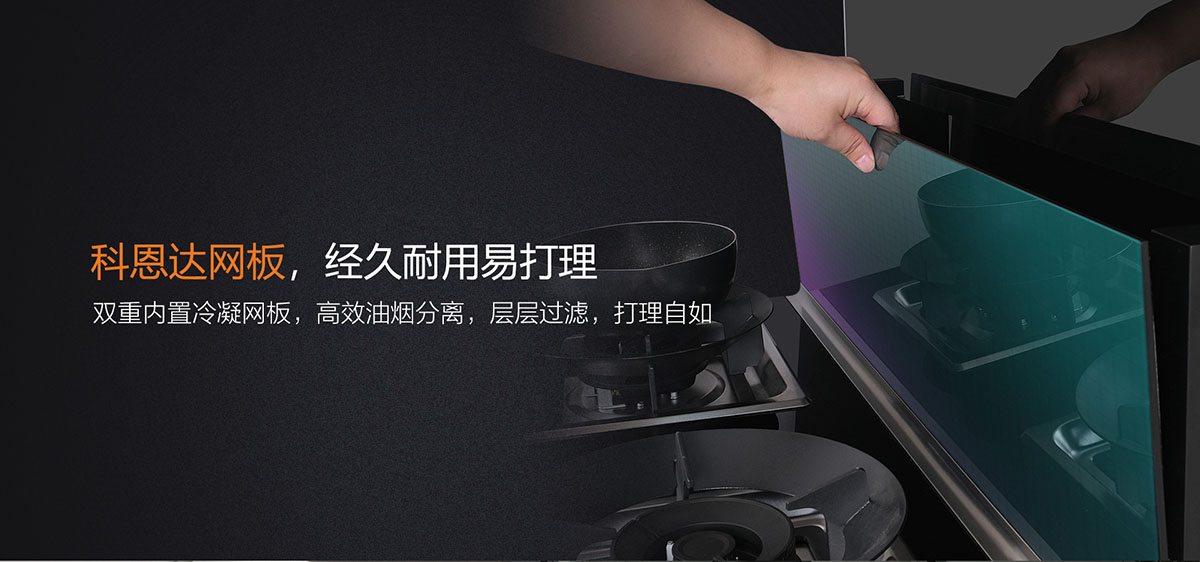 - 雙重冷凝網板,高效油煙分離,打理方便自如