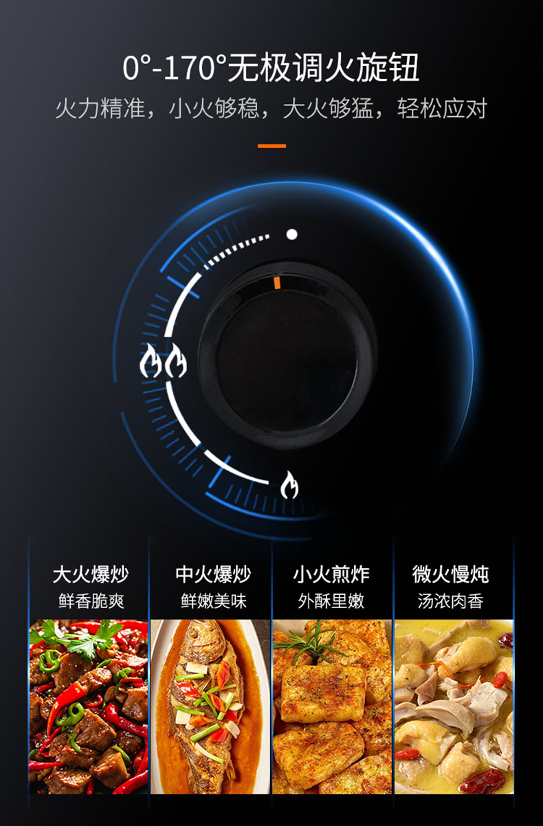 • 0°-170°無極調火旋鈕,火力大小精準控制